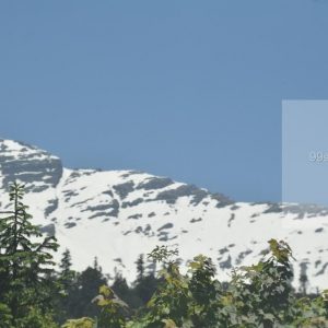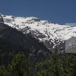 Stock Photo of Pine Tree Forest with Snow Clad Mountains
