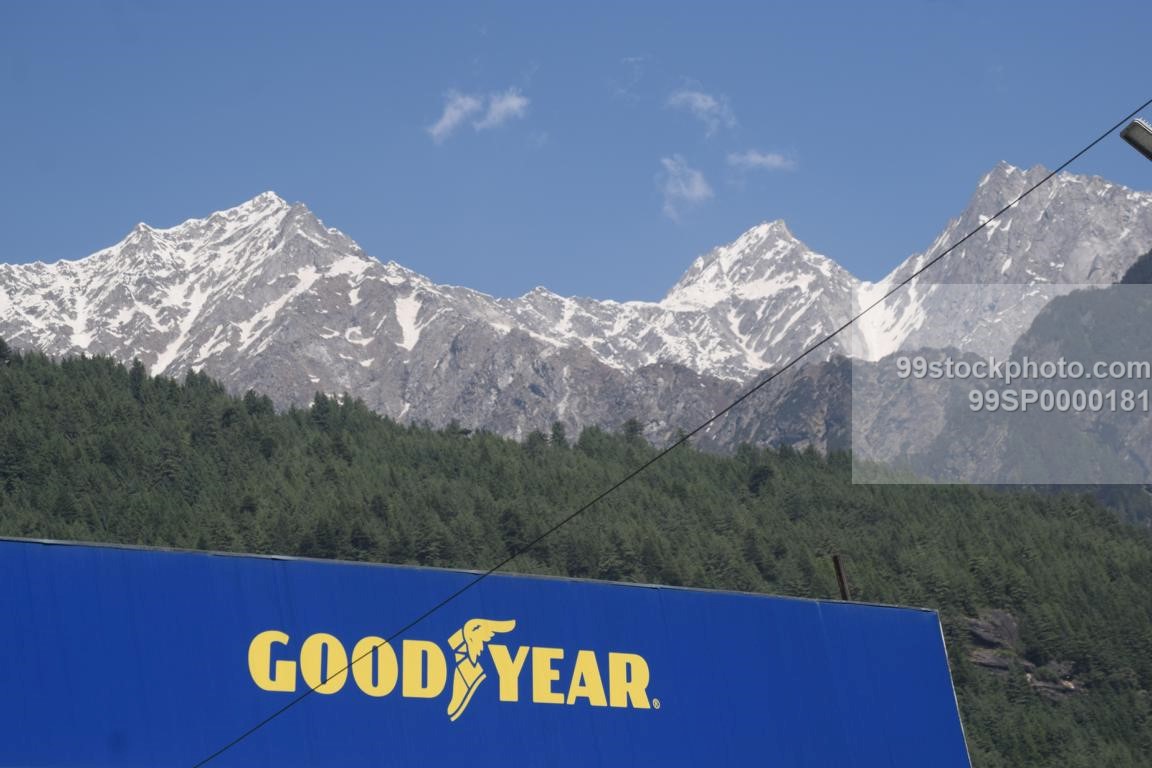 Stock Photo of Goodyear Logo with Snow Clad Mountains in Background